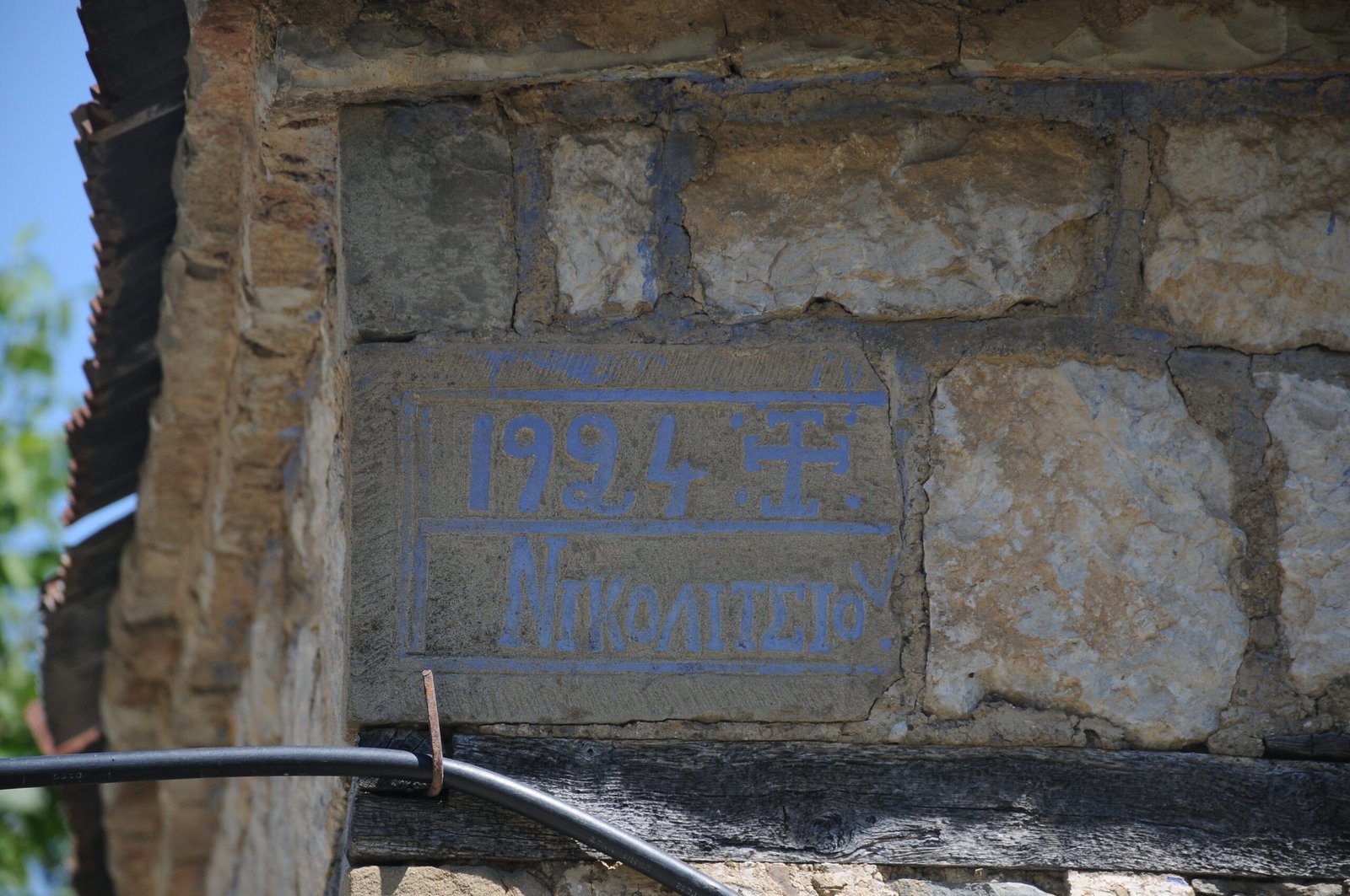 Εικόνα 1. Οικία Αποστόλη Αγγελόπουλου: Κτητορική επιγραφή με Σταυρό «1924 Νικολιτσίου». Διατηρεί το αρχικό επίχρισμα.